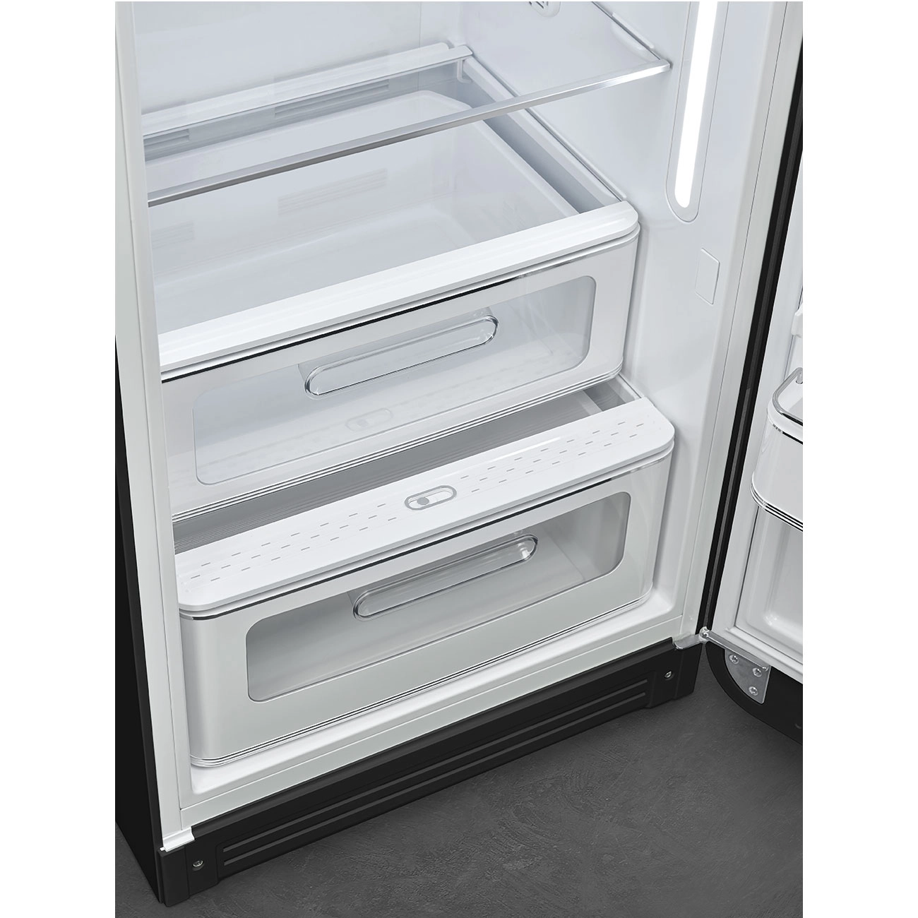 Холодильник SMEG FAB28RDBB5 предлагает продуманное внутреннее пространство, где каждый элемент создан для удобства пользователя. Яркие LED-лампы освещения обеспечивают отличную видимость, позволяя легко находить нужные продукты даже в условиях ограниченного освещения. Просторные ящики для хранения овощей и фруктов поддерживают оптимальные условия для их сохранения, а регулируемые полки делают возможным хранение разнообразных продуктов.